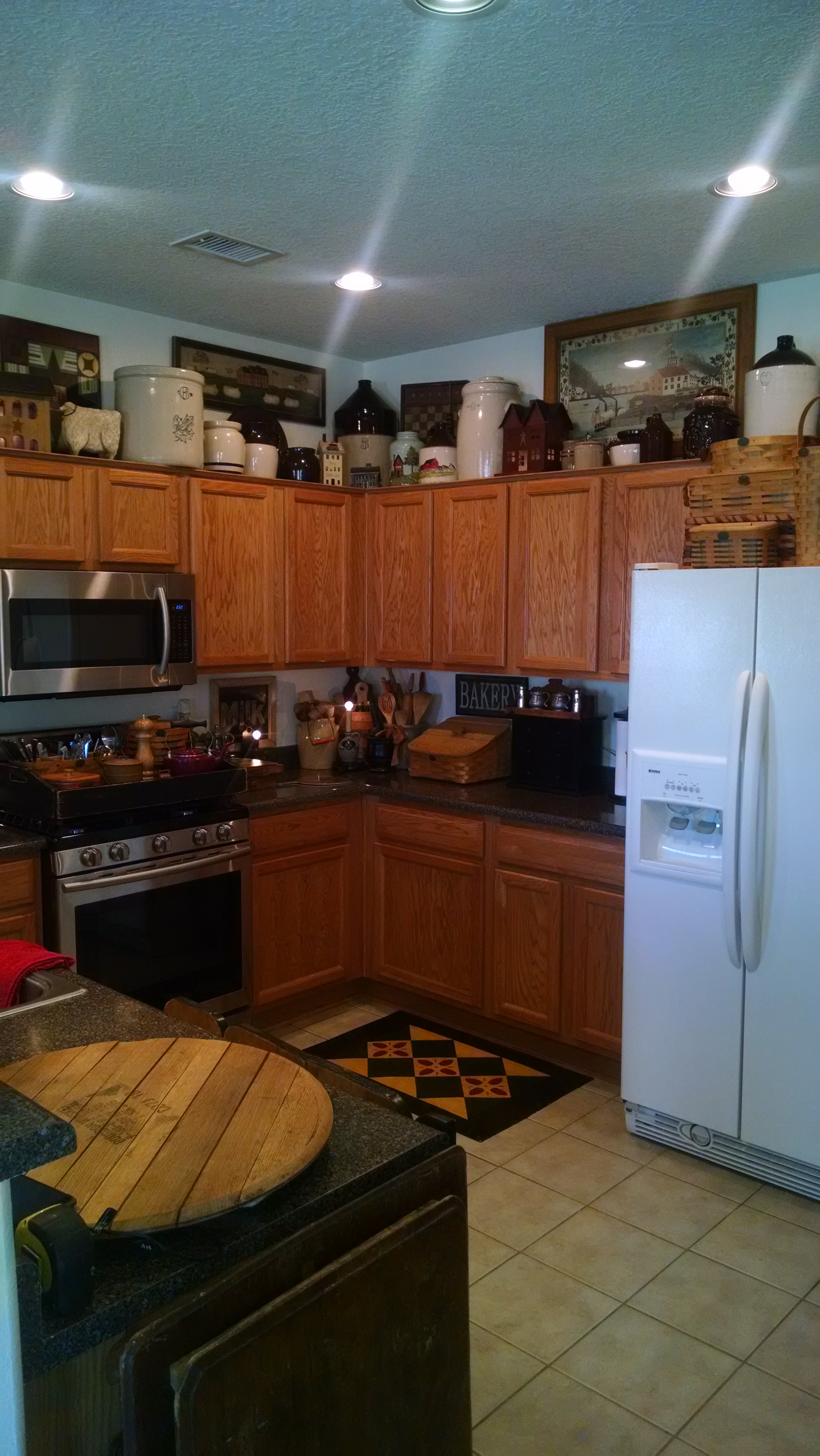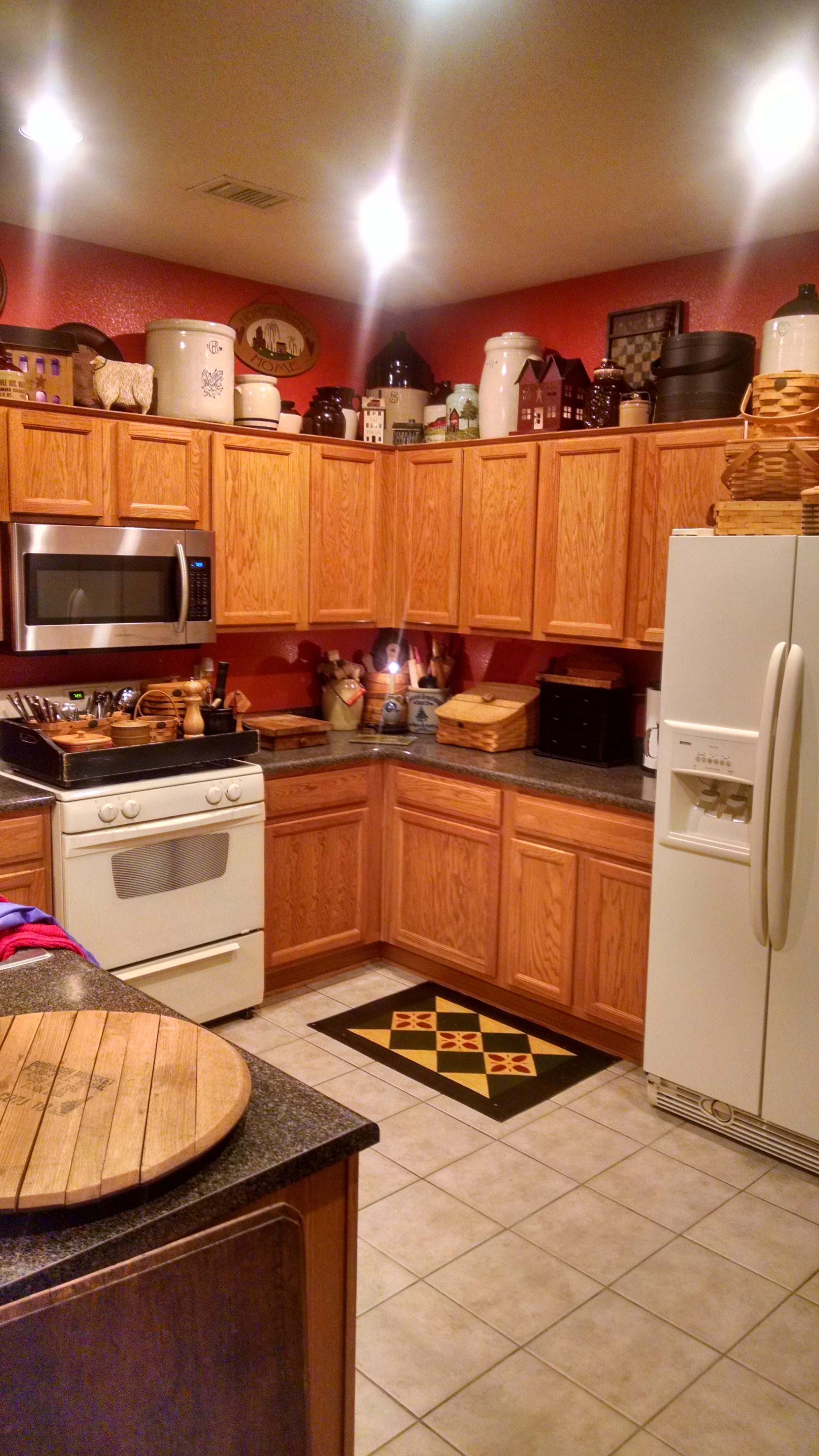 This picture was taken shortly after we moved into the house. The only addition outside of the decorations was the addition of the microwave. But this was just not getting it. I decided the best plan would be to get a new stove and paint the entire first floor white. Figuring this would be a good place to start with a blank canvas. I secretly think that I was already leaning towards the farmhouse style and I could just justify changing everything in the house all at once. So we started that project yep take everything down move it around and paint the entire first floor. Just to share what a job this was I am putting pictures of the rest of the first floor below.