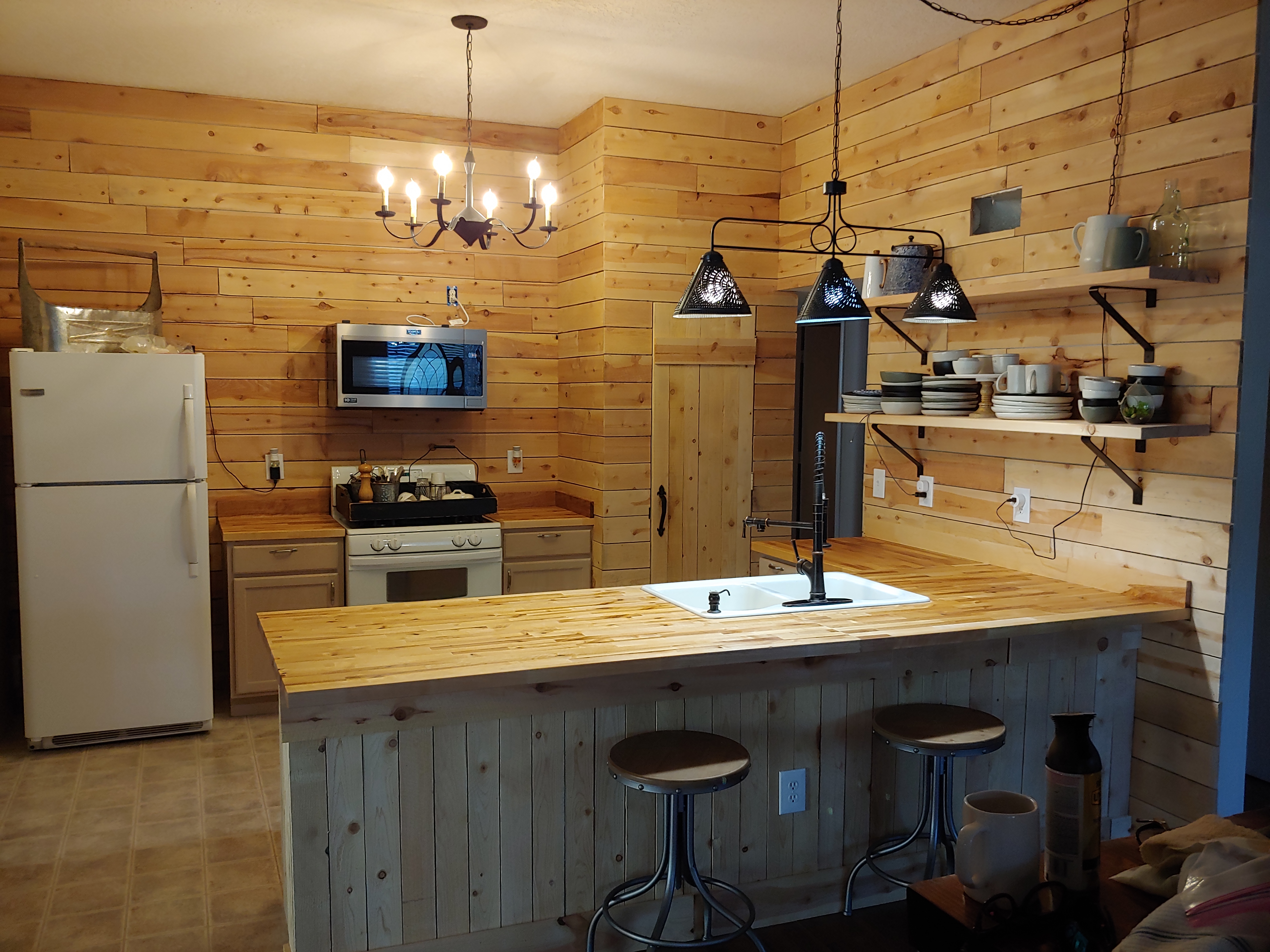 Day 10 and this is where we are at. Miguel has gotten the shiplap on the the walls and front of the kitchen bar. There are a couple of shelves on the one wall (had to have a place to get these dishes outta the boxes. The new butcher block counters are down with this awesome cast-iron sink and professional faucet. We treated the countertop with John Boos Block Mystery Oil and Board Wax. We have tried many different products and let me tell you this one is by far the best product I’ve used. Hung up a light over the sink and things are really coming together. Miguel also covered up the pantry door with fence pickets to make it look like a barn door and it’s awesome a temporary fix on the cheep until I make my mind up about a French door . This is also the day that the new appliances are coming thank you Jesus! I CAN’T WAIT!!!!!! IM SO EXCITED!!!!!!