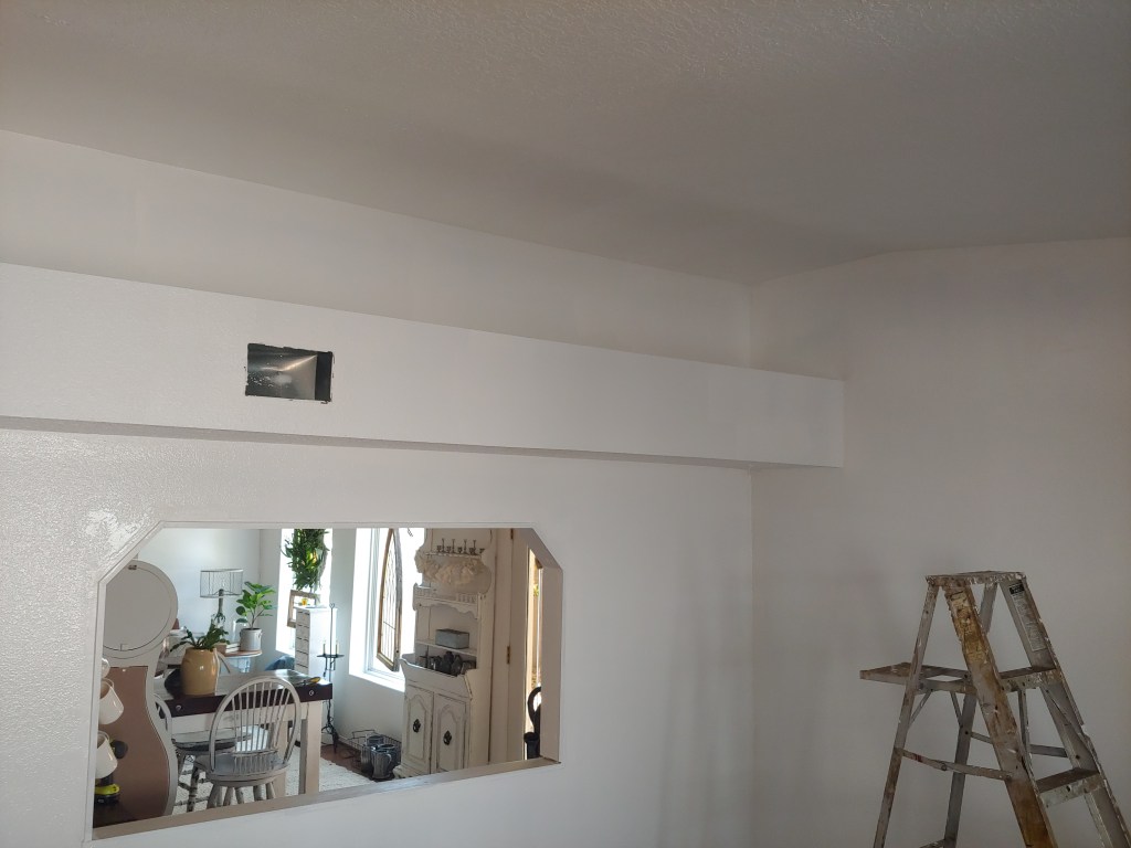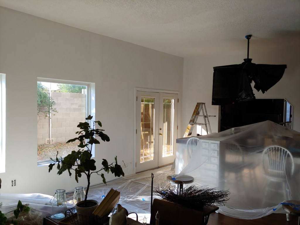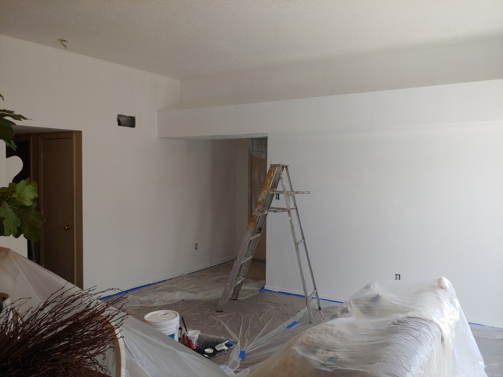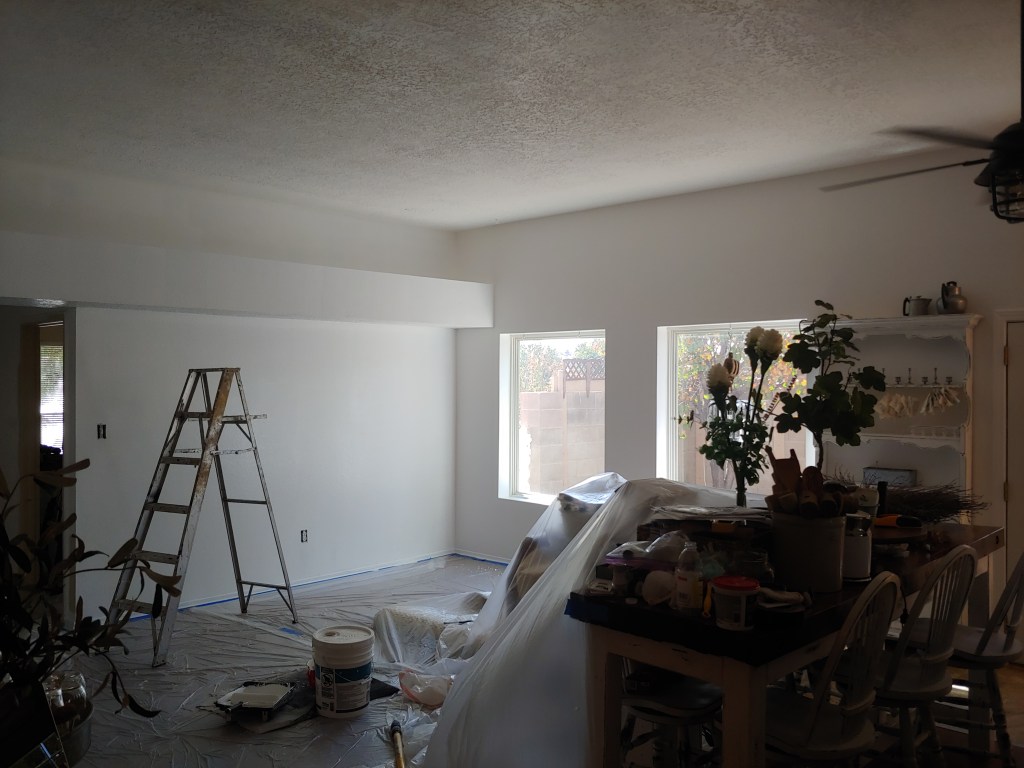 Miguel cannot go any further on the kitchen without the cabinets being done, and hand to god I’m exhausted at this point new house new job I’m over it people but I plow ahead as usual. The first coat is on and waiting a couple days to dry for the second coat. After that the hardware needs to be attached and the new floor put down. So the hubs went in another direction to keep the progress on the new house going because he never stops the Energizer bunny. Sooo unbeknownst to me he just started getting rid of the soul sucking beige paint first on the living/dining room attached to the kitchen and then the family room.