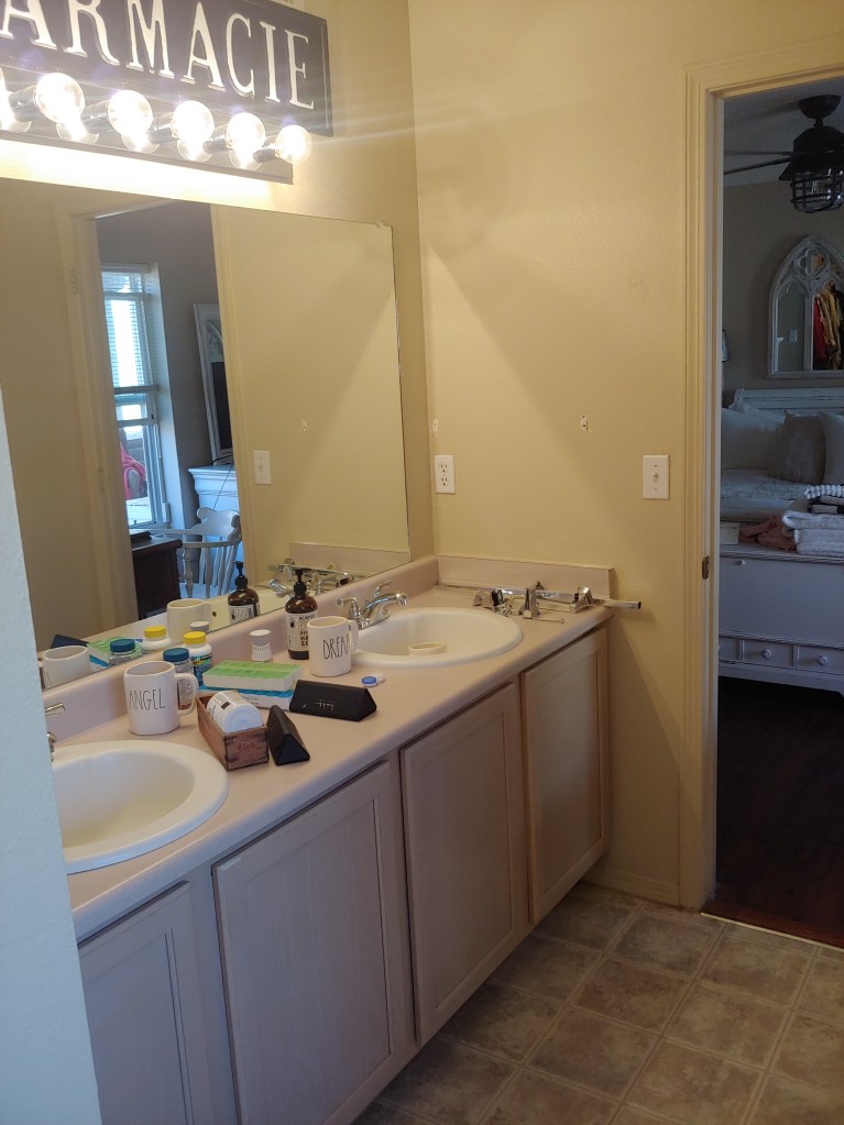 As you can see it had also not been updated since the house was built. The water closet is on the left with the bath tub just past there. Just past the sinks on the right is a stall shower. I have to tell you all this funny story about buying this house. The couple that we bought in from were very nice people and we did buy it during covid but. When we went to the house to look at it the realtor insisted that we wear shoe coverings because the home owner were super neat people. The lady even made a huge deal about it when we went for the inspection practically smacking us in the face with the box of shoe covering.