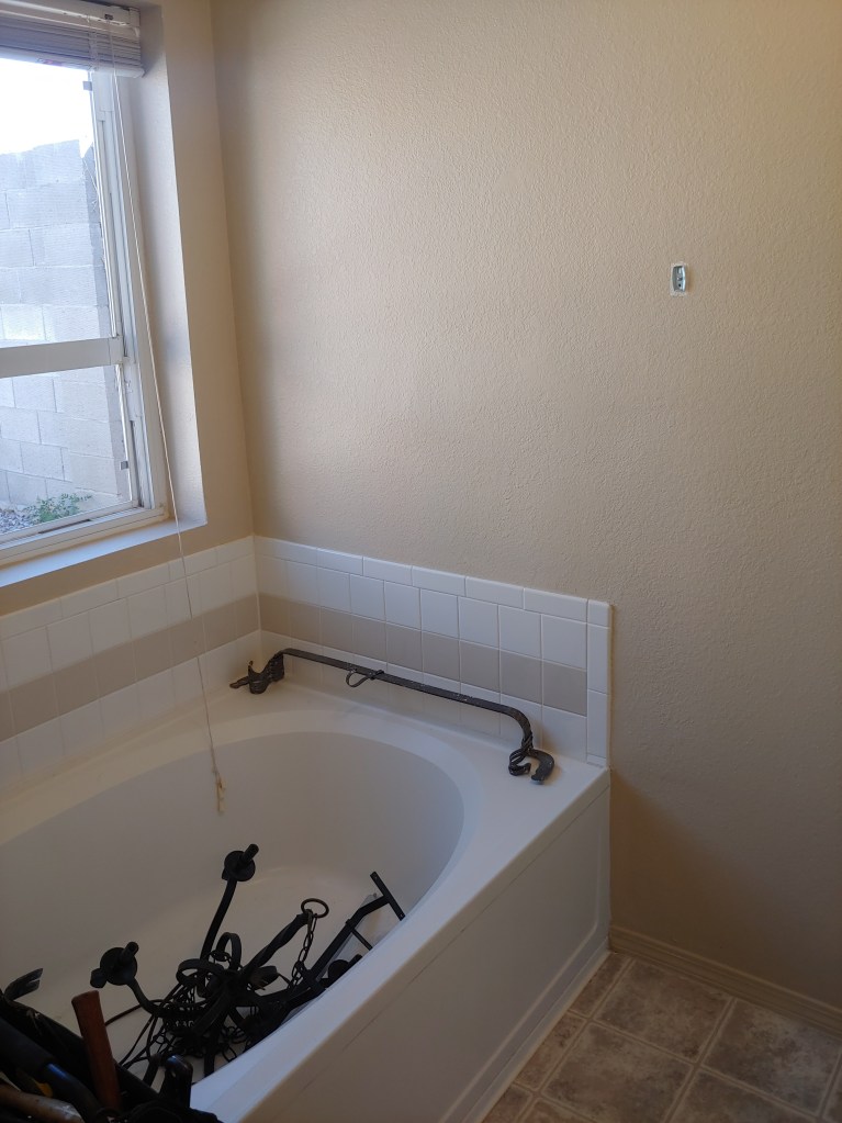 To really make it livable we painted the vanity black to give some contrast. On the vanity I added the same pulls that we used in the kitchen. They were such a great deal and we had a million so we painted the gold. I had Miguel swag a chandelier to give more light in the room. We found some nice little faucets on Amazon that just went really well with the look. The room still needs some work but we had to start somewhere and it will do for now. We plan to replace the counter tops and sinks and Miguel has a plan to replace the bathtub with a two person shower but that will be a major reset and a crap ton of work.