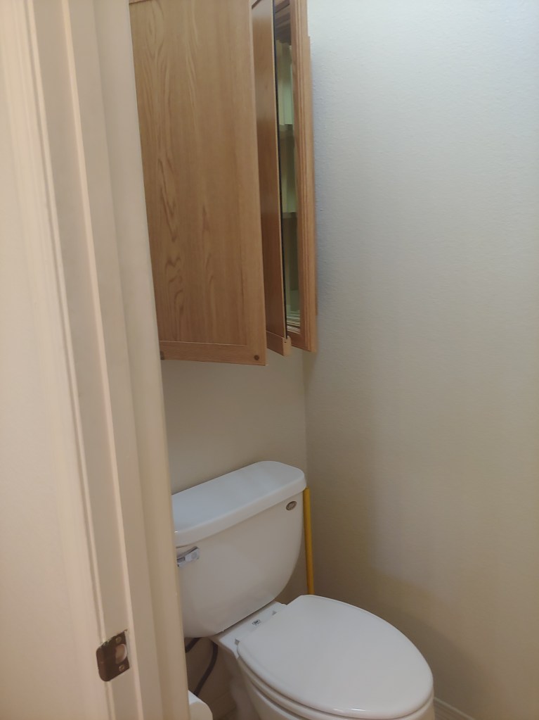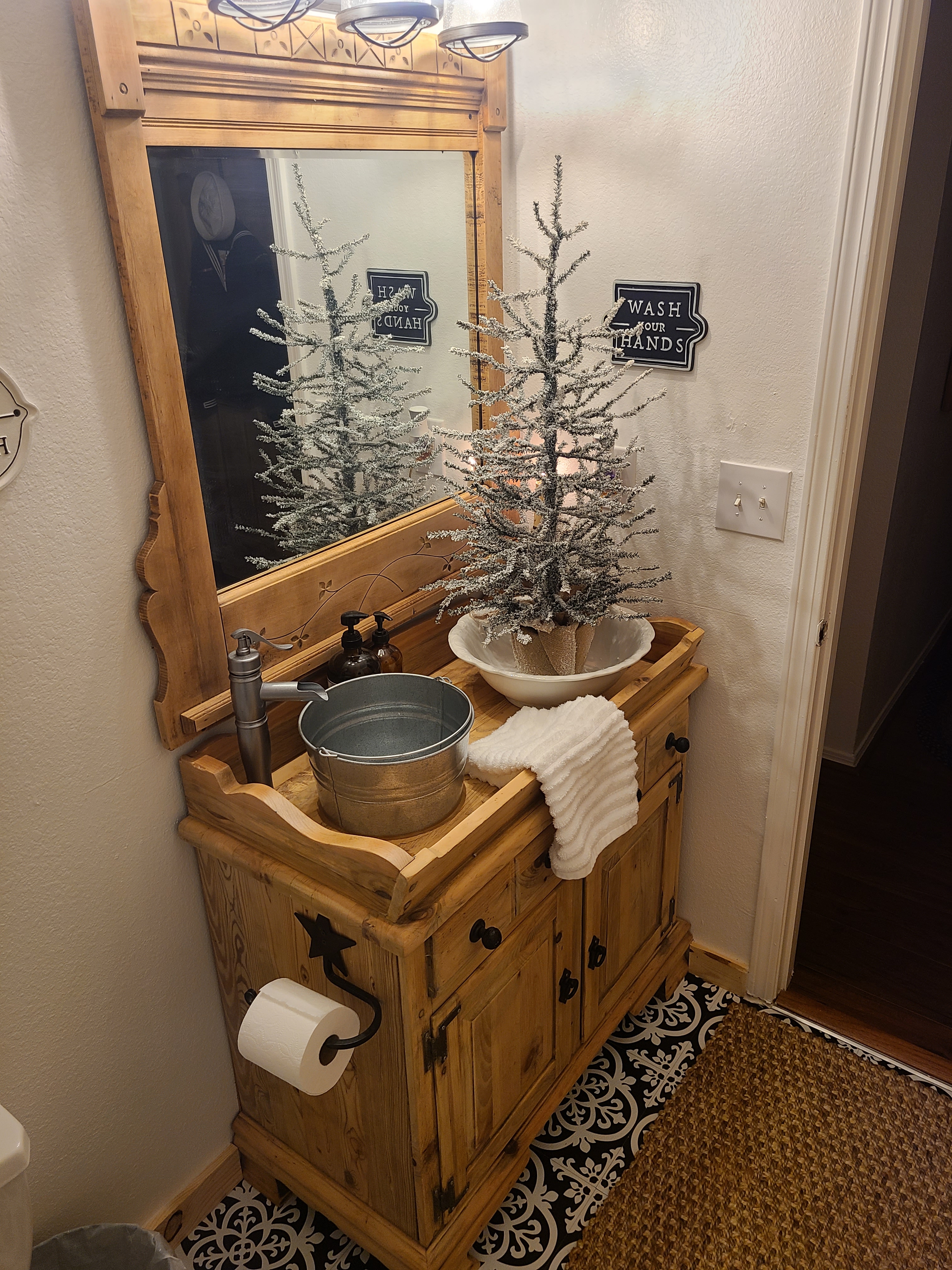 He stripped the black paint off and discovered that the top has a piece of something like cardboard on top of a beautiful butcher block style top! Why would ya! That’s gone cause Duh! he put a new galvanized bucket on it and it turned out amazing. The bucket cost about $10 at Lowe’s. He cut a hole in the bottom of the bucket and ordered a drain from amazon that was like $10. He can do anything I swear it. He also stripped the mirror and the cabinet for over the toilet. We did not bring the light from the old with us be we found a really nice vanity light at Home Depot. It was something like $90 but good lights are hard to find and never cheap.