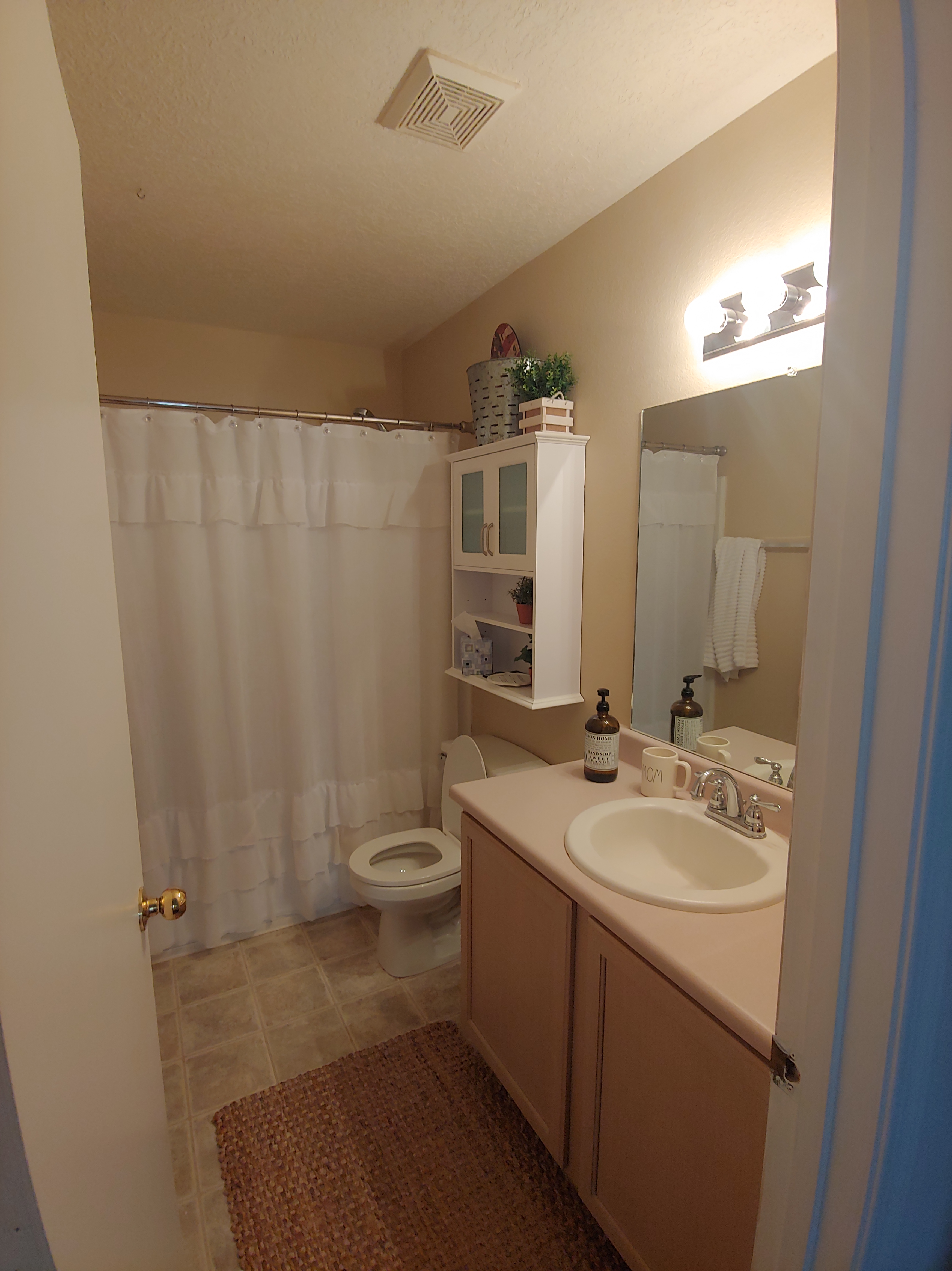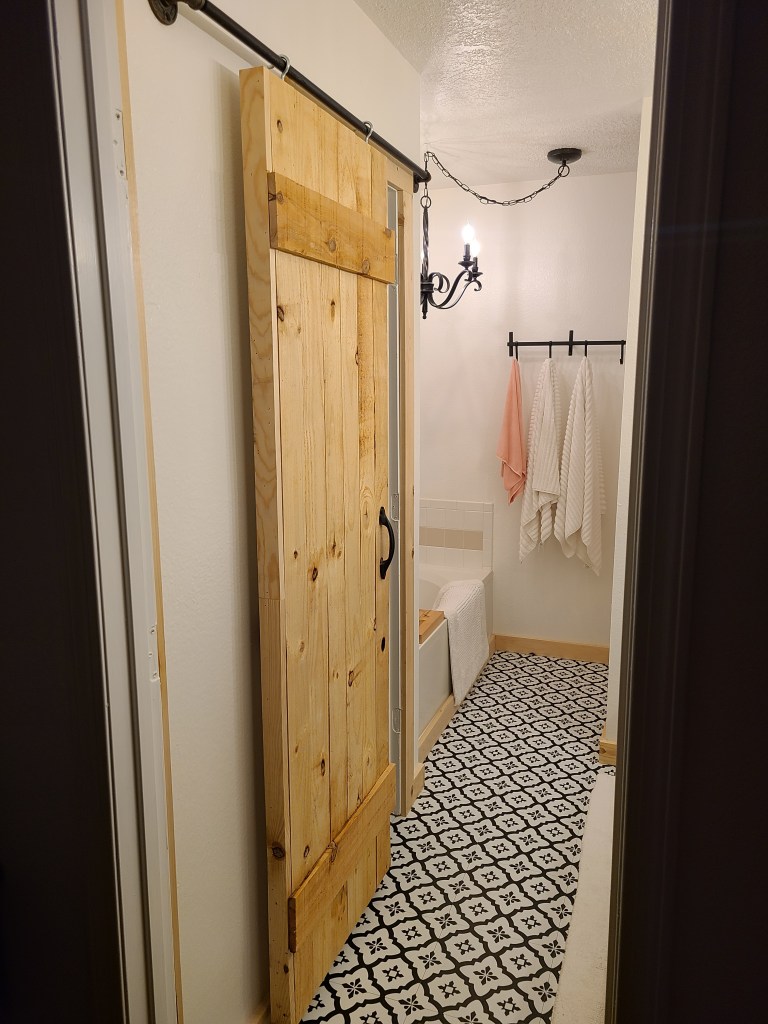 But back to the bathroom. One of the issues with the bathroom and the house in general was an over use of doors. I have no idea why the builder did not use pocket doors it would have been a much better idea. In the previous faux farmhouse there was no door between the bedroom and bathroom so we just took that one off. The door on the water closet was still a problem so we decided to make our own. Miguel took the door and covered it to look like a barn door and fashioned up a sliding door like we have in the kitchen. After that we scrubbed the bathroom clean. We put wood trim around the shower to give it a little more zhoosh. We of course painted the whole thing, put down some cute floor pops installed the awesome light we put in the other bathroom and trim around the mirror. Now we are cooking with fire people this is really staring to look like something.
